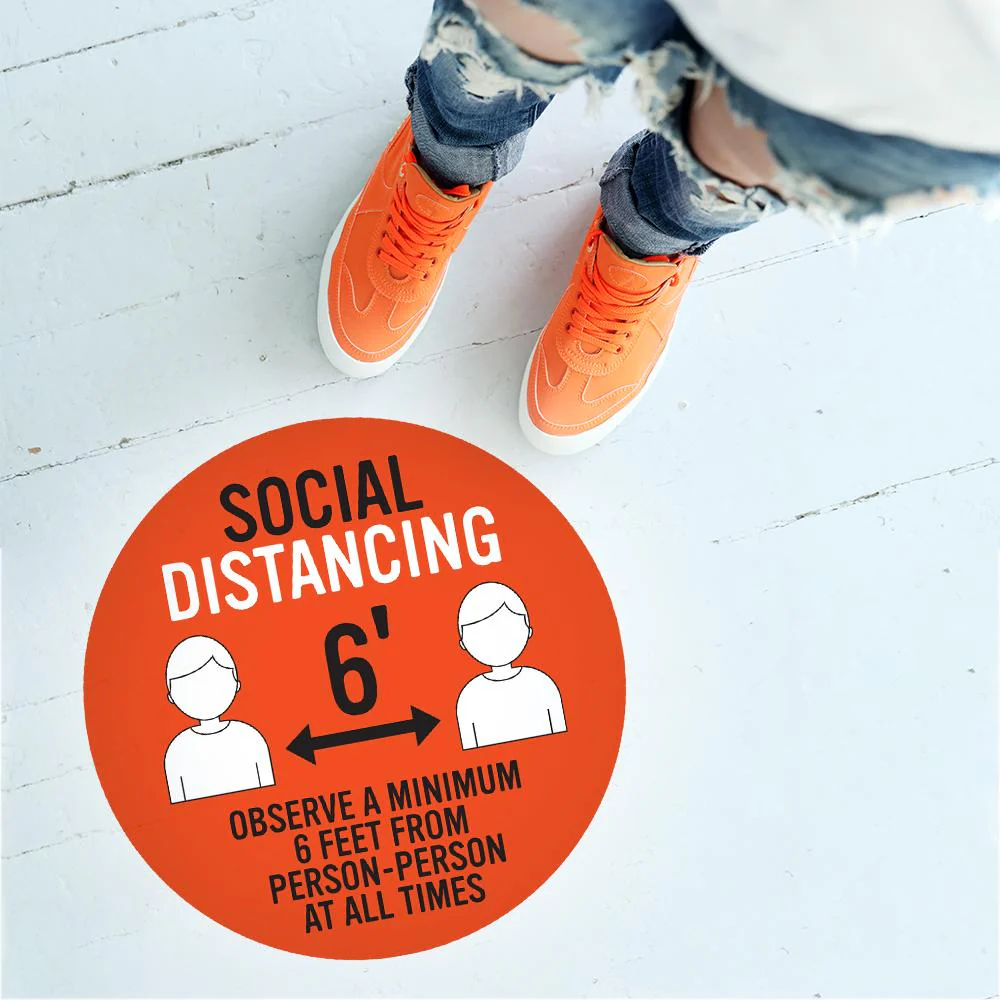 Display this vibrant floor decal as a friendly reminder to adhere to the rules of social distancing. The high-grade polyester construction features a secure grip and resists tearing, stretching and high-traffic activity. These decals work well in grocery stores, airports, restaurants, malls and convention centers. Application works on all indoor hard surfaces, including tiles, concrete, laminate floors and even low pile carpet tiles. When no longer needed, easily remove your Social Distancing Floor Decal with one smooth pull.